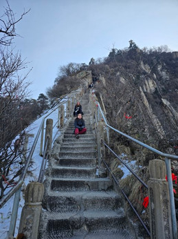 Foi meio complexo se planejar para explorar os picos da Hua Shan, não tinhamos noção de quão extenuante eram as subidas, apesar de bem descrito em nosso Lonely Planet. Ao fim o tempo ficou bem apertado e terminamos o percurso correndo para não perder o último teleférico para descer. Também existem diversos mapas no percurso, mas não é tão fácil decidir qual rumo seguir. Ao fim saimos do pico norte, subimos tudo até passar pelo Jiangshuo pass e alcançar o pico central. Não fomos ao pico leste, dali seguimos ao pico sul onde ficam os penhascos e parte mais emocionante da montanha. Melhor conferir o vídeo para ter uma noção. Pagamos 40RMB cada pelos equipamentos de segurança e partimos pra emoção. Realizado nosso momento adrenalina, já era super tarde e alcançamos o pico sul já no por do sol. Não deu tempo de subir o pico oeste que parecia bem bacana com uma escadaria com visão para os dois lados. Descemos correndo para pegar o teleférico do pico oeste, o mais caro de todos, mas ainda mais espetacular que o norte, lá embaixo tivemos que ainda pegar um onibus caro e demorado que nos levou de volta ao centro de visitante. Mais um didi para a estação, pois o ônibus free já não tinha mais, depois o trem-bala de 20 min (este é fácil pegar, tem direto) para então regressarmos a Xian e conseguimos comer algo. O dia foi tão intenso e corrido que não comemos nada e nem fome sentimos. E demos sorte, apesar do frio, o clima estava super agradável, sem vento e um lindo dia de sol.
