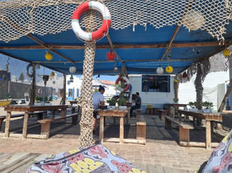 Em Swakopmund, uma cidade mais turística que Walvis Bay que é portuária, nos hospedamos em suítes charmosinhas e bem cêntricas e descansamos um pouco as barracas. Corremos para um rápido rolê pelo centrinho da cidade que já era bem pequenino, mas bem colorido, toda a arquitetura alemã característica. Visitamos o farol, o píer e logo chegou uma cerração que nos privou de um lindo por-do-dol no Atlântico e a temperatura caiu bem e a cidade toda se preparava para dormir e cedo. Alguns poucos restaurantes ficam abertos e recebem os turistas que perambulam como nós. E o bar animado da esquina, provavelmente cheio de turistas, quebrava a calmaria da cidade.