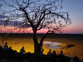 Chegamos ao acampamento Halali correndo para o pôr-do-sol e infelizmente nos atrasamos para a grande atração do dia ver o pôr-do-sol do waterhole de Halali, que é um espetáculo a parte. Enfim, conseguimos presenciar o entardecer, um momento lindo e mágico, um plateia acompanhava a algazarra das aves com elefantes e zebras bebendo água enquanto as cores mudavam no horizonte.