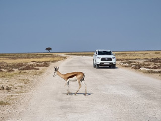Como chegamos no começo da tarde, o sol estava forte e fazia muito calor, sabíamos que seria mais difícil encontrar os animais e teríamos que já conduzir com poucas paradas para chegar ao camping de Halali antes do por-do-sol quando os portões se fecham. Ainda assim, conseguimos ver uma boa variedade de bichos entre girafas, elefantes, zebras, um rinoceronte branco a distância, leoas (infelizmente não conseguimos ver leões em nossa passagem pelo Etosha) e muitos springboks, o veadinho bem comum por lá.