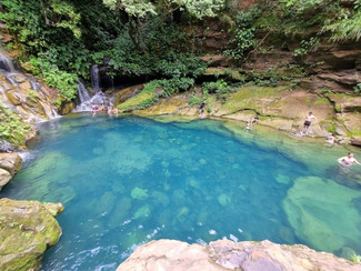 Depois do deleite naquele precioso poço de águas cristalinas azuis, algo realmente surreal, do Encanto Azul fomos para o Poço Azul que fica 6km antes. Este já um balneário estruturado e as águas também azuis mas não tão cristalinas, mas um lugar também muito lindo com cachoeiras a volta e próximo ali a também imponente cachoeira Santa Bárbara.
